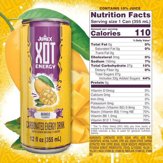Jumex XOT Carbonated Energy Drink, Mango Flavor, 12 Fl Oz 12 Pack